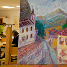 Mit Hilfe flüssiger Maltechniken versuchen wir über das bloße Abbild der Landschaftsmalerei hinaus zu kommen und allgemeingültige, bildnerische Aussagen über das Erscheinungsbild der Landschaft zu treffen. Anfängern wird parallel ein